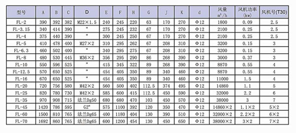 FL空气冷却器外形尺寸示意图及尺寸表(推荐空气(风)流速1-3m/s,电机电压为380v,特殊情况由需方确定)